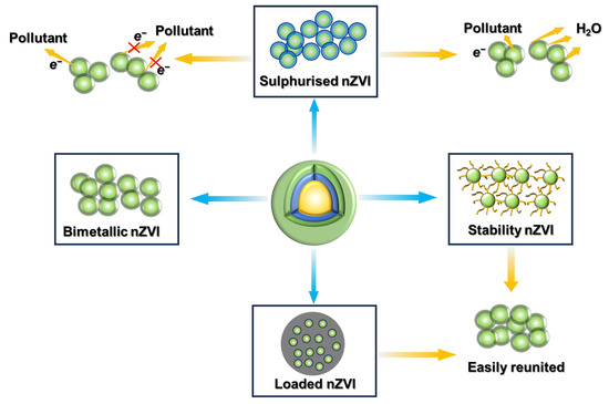 Application defects and common modifications of nZVI (Blue arrows indicate the modification technique and green arrows indicate the shortcomings of the technique).