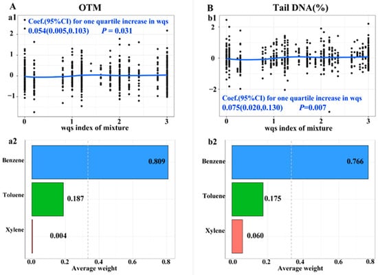 The dose–effect relationship of co-exposure to the BTX mixture (a1,b1) with (A) OTM and (B) tail DNA%, as well as the contribution of individual BTX components (a2,b2). Abbreviations: wqs, weighted quartile sum index for BTX mixture; Coef. (95% CIs), coefficients and 95% confidence intervals; OTM, olive tail moment; Tail DNA%, percentage of DNA in the comet tail. The gWQS models were adjusted by age, gender, smoking status, pack-years of smoking, drinking status, factory location, and BMI.