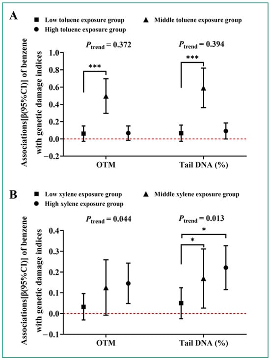 Modifying effects of (A) toluene and (B) xylene on the associations [β (95% CI)] of benzene with OTM and tail DNA%. Abbreviations: OTM, olive tail moment; Tail DNA%, percentage of DNA in the comet tail. The lines represent the associations of benzene CE levels with genetic damage indices which were analyzed by generalized linear models adjusted for age, gender, smoking status, pack-years of smoking, drinking status, factory location, and BMI. The red dashed line represents the baseline (no association, β = 0). Significant levels are annotated as *** Pinteraction < 0.001 in comparison to the low-exposure group and * Pinteraction < 0.05 in comparison to the low-exposure group.
