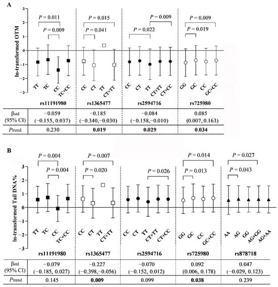 We first compared the levels of OTM and tail DNA% in workers carrying different genotypes, and then investigated the associations of the number of variant alleles with OTM and tail DNA% (Table S6 and Figure 3). We found that after adjusting for multiple confounding factors, the genotypes and/or the numbers of mutant alleles of rs11191980, rs1365477, rs2594716, rs725980, and rs878718 significantly influenced OTM and/or tail DNA% (Table S6 and Figure 3). Specifically, for rs11191980, when compared with carriers of wild homozygotes (TT) and heterozygotes (TC), workers with mutant homozygotes (CC) had significantly lower mean OTM (TT: −0.82; TC: −0.65; CC: −1.40; p < 0.015) and tail DNA% (TT: 0.58; TC: 0.73; CC: −0.07; p = 0.004). For rs1365477, carriers of wild homozygotes (CC) had significant higher OTM (CC: −0.77; CT: −1.05; CT + TT: −1.02; p < 0.045) and tail DNA% (CC: 0.63; CT: 0.31; CT + TT: 0.34; p < 0.025) when compared with the carriers of CT or T alleles (i.e., CT + TT), and the number of mutant T alleles was negatively associated with both OTM (β = −0.185, Ptrend = 0.019) and tail DNA% (β = −0.227, Ptrend = 0.009). For rs2594716, when compared with carriers of wild homozygotes (CC) and/or C allele (i.e., CT + CC), subjects with mutant homozygotes (TT) had significantly lower mean OTM (CC: −0.80; CT + CC: −0.78; TT: −0.99; p < 0.025) and tail DNA% (CT + CC: 0.62; TT: 0.42; p = 0.026), and the number of mutant T alleles was significantly negatively associated with OTM (β = −0.084, Ptrend = 0.029). For rs725980, when compared with carriers of wild homozygotes (GG), workers with GC or mutant C alleles (i.e., GC + CC) had significant higher OTM (GG: −0.87; GC: −0.70; GC + CC: −0.71; p < 0.020) and tail DNA% (GG: 0.53; GC: 0.70; GC + CC: 0.69; p < 0.035). Furthermore, the number of rs725980 C alleles was positively associated with OTM (β = 0.085, Ptrend = 0.034) and tail DNA% (β = 0.092, Ptrend = 0.038). For rs878718, when compared with the carriers of wild homozygotes (AA), workers with an AG genotype and mutant G alleles (i.e., AG + GG) had significant higher tail DNA% (AA: 0.55; AG: 0.63; AG + GG: 0.62; p < 0.045). However, we did not observe any statistically significant between-genotype differences (all p > 0.05) or associations (all Ptrend > 0.05) in the two genetic damage indicators for other SNPs (Table S6).