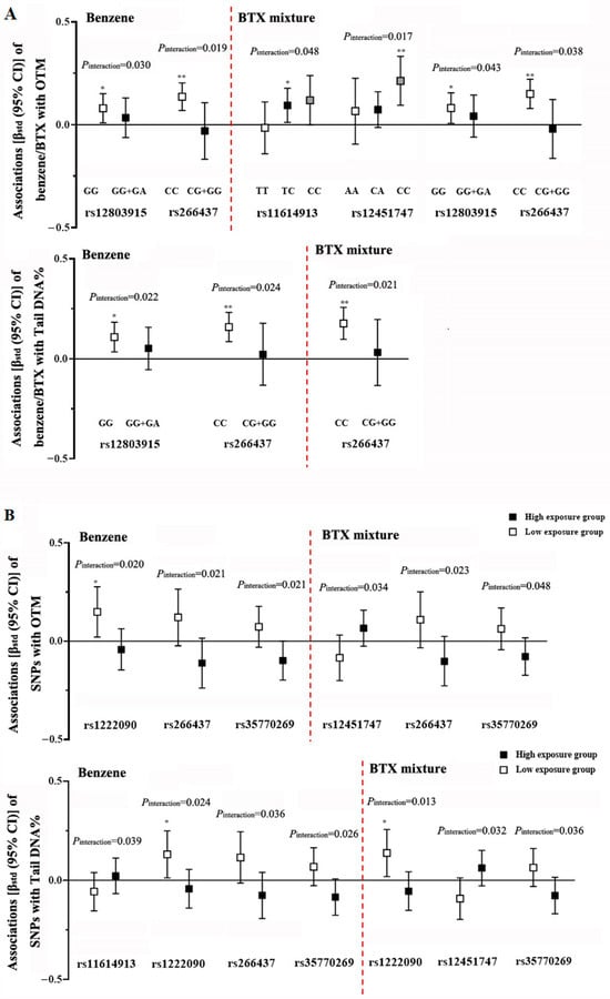 Significant modifying effects of (A) SNPs and (B) benzene/BTX exposure on each other’s associations with OTM and tail DNA%, with Pinteraction < 0.05. Abbreviations: OTM, olive tail moment; Tail DNA%, percentage of DNA in the comet tail. The lines represent the associations [βstd (95% CI)] evaluated by multivariate linear regression models with adjustment for age, gender, smoking status, pack-years of smoking, drinking status, factory location, and BMI. * Ptrend < 0.05, and ** Ptrend < 0.01.