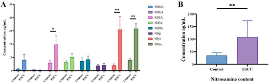 Association between the diet lifestyle behaviors and risks of ESCC. (A) Levels of nine N-nitrosamines (NDMA, NMEA, NDEA, NDPA, NDBA, Npip, Npyr, and Nmor) in urine samples of ESCC patients and healthy controls. (B) Total nitrosamines in the urine of ESCC patients and healthy controls. * p < 0.05; ** p < 0.01.