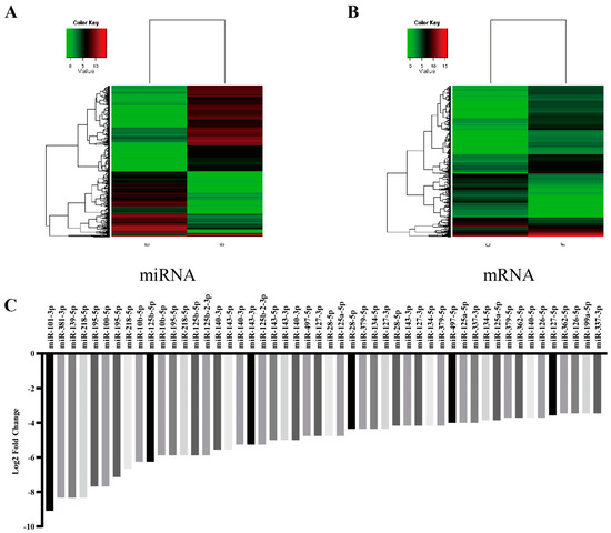 ESCC cancer tissues and their adjacent paracancerous tissues of three patients with new-onset ESCC were screened for miRNA and mRNA differences in the tissues by miRNA and mRNA combination microarrays. A total of 288 miRNAs were differentially expressed in ESCC and adjacent paracancerous tissues; among them, 109 miRNAs were up-regulated in ESCC tissues, and 179 miRNAs were down-regulated. Among them, hsa-miR-101-3p was the most down-regulated (Figure 2).