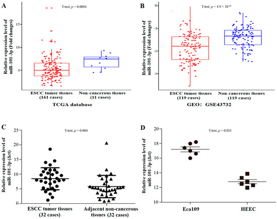 2.3. MiR-101-3p Expression Validation in the TCGA, GEO Genome Databases, ESCC Patients Tissue Samples, and Cell Line