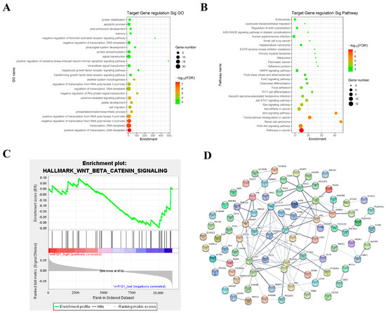 Transcription factors of miR-101-3p target genes are involved in the regulation of the Wnt signaling pathway. (A) GO analysis of miR-101-3p target genes. (B) MiR-101-3p target gene pathway analysis. (C) Gene enrichment analysis. (D) Building a PPI network.
