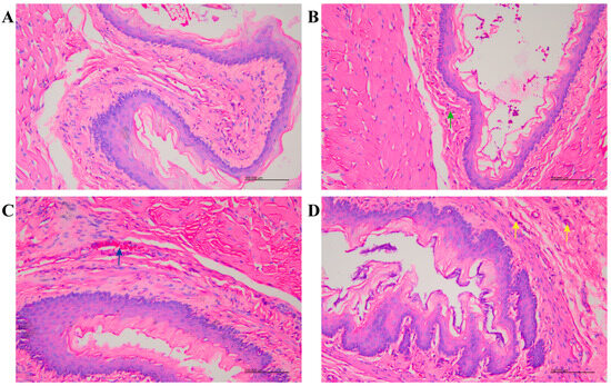 Subchronic exposure to MNNG causes damage to the rat esophagus. (A) Control; (B) 0.12 mg/kg MNNG-contaminated group, 0.12 mg/kg MNNG group, green arrow shows erosive necrosis of the esophageal mucosa in rats; (C) 0.16 mg/kg MNNG group, blue arrow shows submucosal hemorrhage in the rat esophagus; (D) 0.20 mg/kg MNNG poisoning group, yellow arrows shows inflammatory cell infiltration in rat esophagus.
