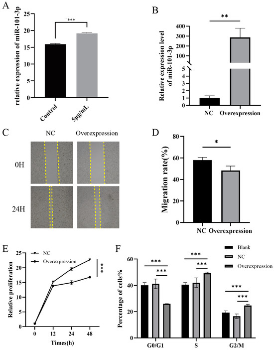 Biological function of miR-101-3p in MNNG-induced proliferation of Eca109 cells. (A) RT-qPCR validation of changes in miR-101-3p expression levels after 5 μg/mL MNNG staining of Eca109 cells. (B) RT-qPCR validation of miR-101-3p transfection in Eca109 cells. (C,D) Cell scratch assay. (E) CCK8 determines the proliferation level of Eca109 cells after transfection. (F) Cell cycle determination by flow cytometry. * p < 0.05, ** p < 0.01, *** p < 0.001.