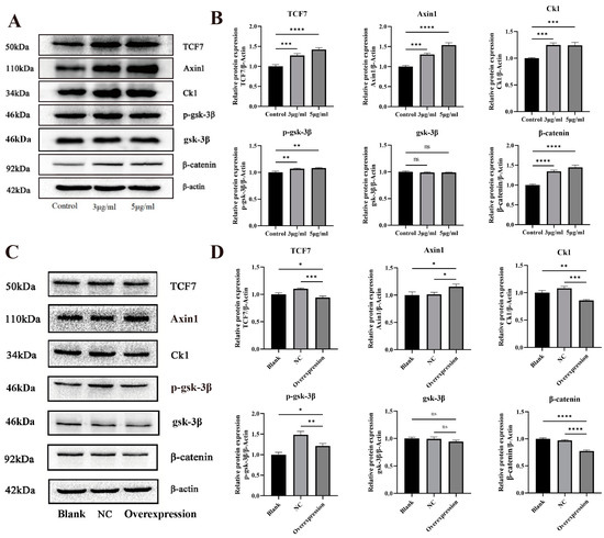 (A,B) Western blot validation of key proteins of the Wnt pathway after subchronic staining of Eca109 cells with MNNG. (C,D) Western blot validation of key Wnt pathway proteins after overexpression of miR-101-3p in Eca109 cells. * p < 0.05; ** p < 0.01; *** p < 0.001; **** p < 0.0001; ns p ≥ 0.05, no significant difference.