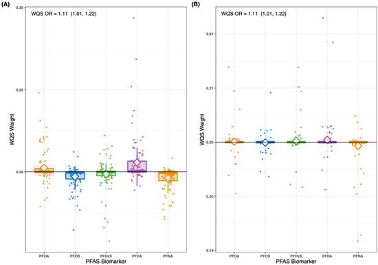 Empirical weights estimated from repeated holdout validation of PFAS biomarkers indicating relative contribution to the PFAS index for (A) the positive direction model or (B) negative direction model. Boxplots show the 25th, 50th, and 75th percentiles with the whiskers as 1.5 times the interquartile range (IQR) for 100 holdouts. White diamonds show mean weights for the 100 holdouts. Black line indicates the concern threshold (threshold = 0.20). The association with the WQS index is embedded as text.