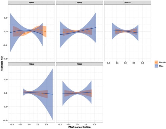 Considering the sex-specific associations of PFAS exposure with psoriasis risk, we performed sex-stratified multivariable-adjusted RCS analyses for the five PFAS to explore the dose–response relationships. A non-linear association was observed between PFOA and psoriasis in females (p for overall association < 0.05 and p for non-linearity < 0.05, Supplemental Figure S3B). However, no significant linear or non-linear associations were found for the other PFAS in either males or females (Supplemental Figures S3–S7).
