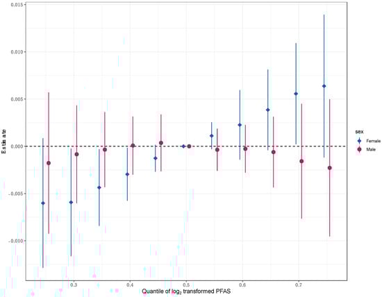 Sex-specific associations of each individual PFAS with psoriasis risk in the BKMR model. This plot describes the estimated psoriasis risk associated with a change in each individual PFAS from its 25th to 75th percentile, when all the other PFAS are fixed at the 25th, 50th, or 75th percentile. Dots indicate the estimate, and horizontal lines indicate the 95% credible intervals.