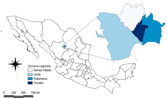 The Comarca Lagunera, southwest of Coahuila and northeast of Durango, is one of Mexico’s most important productive areas. Its main economic activities are livestock, agriculture, and the processing industry. Anthropogenic activities in the region have led to increased environmental pollution, bringing with them a growing need for monitoring, remediation, and prevention measures []. The Comarca Lagunera is home to the world’s largest silver refining plant, the leading producer of gold and lead in Latin America. The metallurgical complex in the region is composed of lead smelting and lead–silver refining and has a capacity of 118,000 tonnes of bullion in the lead smelter [].