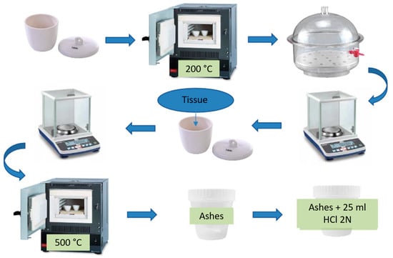 Porcelain crucibles were brought to constant weight at a temperature of 200 °C for 2 h in an oven, after which they were left to stand in a desiccator for 2 h, and their weight was recorded. The organs chosen for the study were dried using an oven at 105 °C and handled in the crucibles at constant weight. The weight of each organ was recorded, and they were then incinerated at 500 °C for 12 h in the muffle. After this period, the resulting ashes were suspended in 25 mL of HCl solution with a 2N concentration following the methodology of Delgado []. The ashes suspended in 2N HCl were diluted using distilled water to concentrations favoring their reading in the spectra (Figure 2). Analysis of the concentrations was performed using graphite furnace atomic absorption spectrophotometry, the blanks were Tritón 100x and array modifier, and the 2N HCl was also used as a blank during the analysis to check the presence of contamination of samples. This study used a NIST 1577b bovine liver sample, with a recovery of >92%, a quantification detection limit of 10 ng/g, and a detection limit of 3 ng/g.