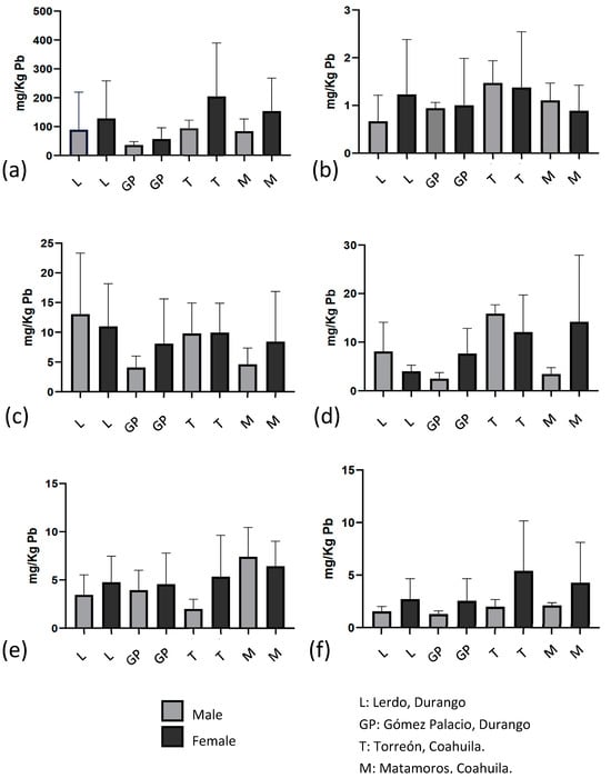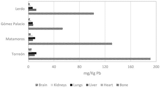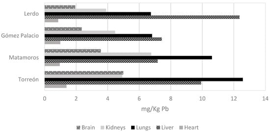 Among the four cities analyzed within the Comarca Lagunera, it was found that there was a significant difference in the city of Torreón, Coahuila, in relation to the rest of the cities; no significant statistical difference was found among the sampled localities. However, the maximum values of this pollutant were found in three of the six organs belonging to the individuals sampled in this city. Torreón, Coahuila, has one of the most important sources of lead emissions in northern Mexico (mining and metallurgical industry). This is the possible reason why in this and other studies, it is considered to be the city with the highest concentrations of this pollutant in the Comarca Lagunera; also, in this region, there is an import background of lead toxicosis in children, where the reported concentration have decreased over time [].