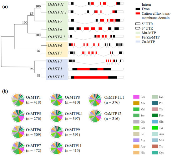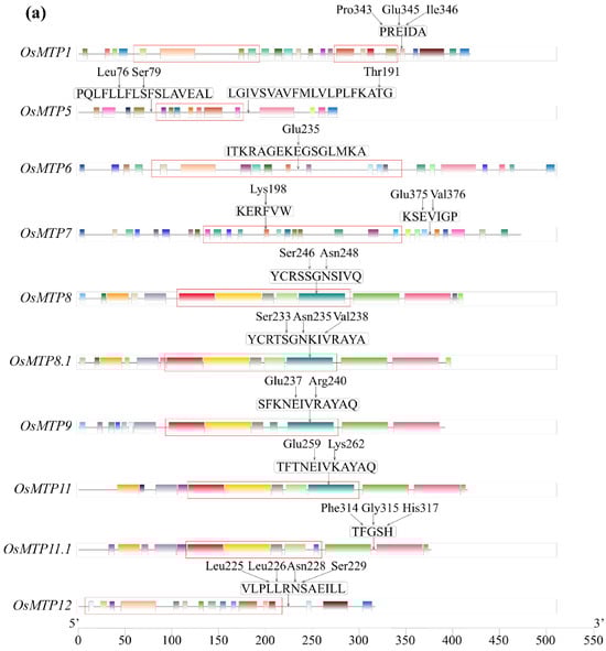 Based on the phylogenetic analysis of rice MTPs (Figure 1a), 10 isogenes were grouped in 3 clusters, i.e., Zn-MTP (OsMTP1, OsMTP5, and OsMTP12), Fe/Zn-MTP (OsMTP6 and OsMTP7), and Mn-MTP (OsMTP8, OsMTP8.1, OsMTP9, OsMTP11, and OsMTP11.1). As shown in Figure 1a, all rice MTP genes had different number and length of exon or intron. For instance, in the cluster of Zn-MTP, OsMTP5 had 6 exons and 9 introns, wherein OsMTP1 and OsMTP12 only had 3 and 2 exons, respectively. In the cluster Fe-Zn MTP, OsMTP6 had 7 exons and 11 introns, while OsMTP7 had 5 exons and 10 introns. In the cluster Mn MTP, all isogenes of OsMTPs had 4 exons, but the lengths were quite different, wherein they contained 4–6 introns.