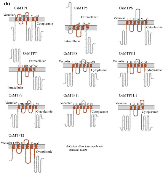 The cation efflux transmembrane domains (TMDs) in all rice MTP isoproteins were verified by the program Protter 1.0. As shown in Figure 2b, there were 4–6 TMDs in rice plants located at different sites of the protein sequences of rice MTPs, wherein four TMDs were located at the MTP1 protein sequence of 54–187, and four TMDs were distributed at the MTP1 protein sequence of 273–338. MTP5 and MTP11 had four TMDs located at the different sites of the protein sequences of 73–197 and 125–319, respectively. MTP7 had five TMDs located at the sequence of 129–345. The other MTPs had six TMDs located at the different sites of the protein sequences of OsMTP6 (76–298), OsMTP8 (109–311), OsMTP8.1 (96–298), OsMTP9 (100–299), OsMTP11.1 (124–283), and OsMTP12 (12–234), accordingly. We also noticed that eight rice MTP genes including OsMTP1, OsMTP6, OsMTP8, OsMTP8.1, OsMTP9, OsMTP11, OsMTP11.1, and OsMTP12 were located at the vacuole membrane, while the other two MTP genes (OsMTP5 and OsMTP7) were distributed at the membrane.