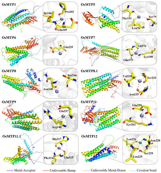 The Hex program was used to stimulate the interaction between Ga3+ ions and the OsMTP protein and identify the possible protein-compatible binding sites. Figure 3 shows the interaction sites of 10 individual OsMTP proteins with Ga3+ ions. One to four binding sites located at different amino acid residues were identified in individual OsMTP proteins. For instance, Ga3+ ions bind to Pro (343), Glu (345), and Ile (346) amino acid residues of OsMTP1, and three different types of bonds, including metal acceptor, unfavorable metal-donor, and unfavorable bump are formed between the Ga3+ ions and the amino acid residue at OsMTP1, wherein these types of bonds have weaker affinity potential compared with the covalent bond. Specially, the carbonyl (–C=O) of Pro (343) located at C-CA-CB-CG-CD of OsMTP1 provides a site for binding Ga3+ ions through metal-acceptor interaction, while the carboxyl (–COO-) of Glu (345) located at the C-CA-CB-CG-CD of OsMTP1 is the binding site for Ga3+ ions through metal acceptor interaction. The detailed information of binding sites at the specific amino acid residues of individual OsMTP are given in Table 3.