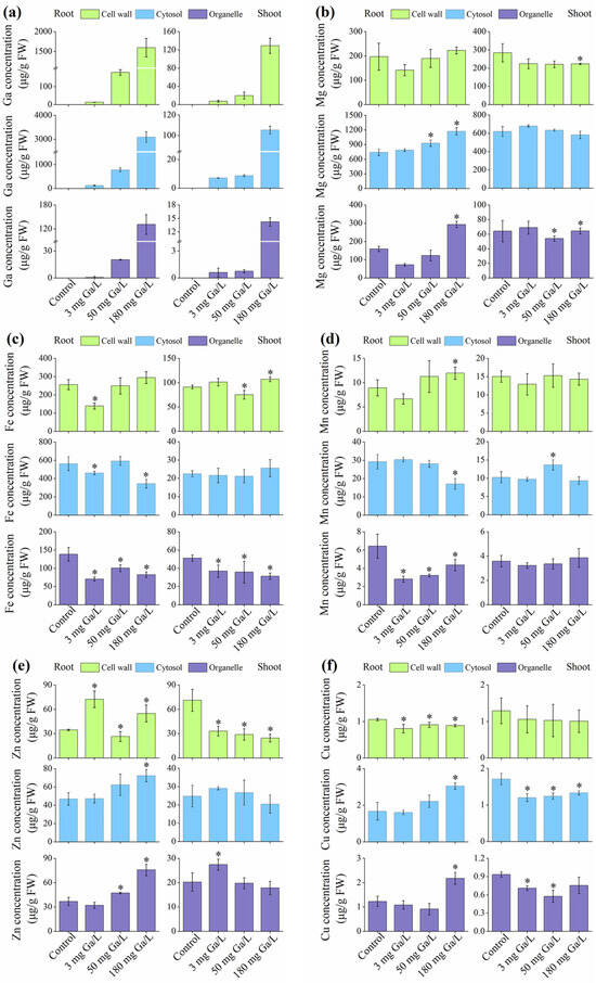 Subcellular concentrations (μg/g FW) of Ga (a) and mineral elements, including Mg (b), Fe (c), Mn (d), Zn (e), and Cu (f) in rice tissues. Values are the mean of four independent biological replicates ± standard deviation. NA denotes concentrations below the limit of Ga detection. The asterisk (*) refers to the significant difference between Ga treatments and control.
