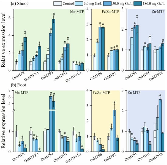 The expression abundance of the 10 OsMTP genes was evaluated in shoots (Figure 5a) and roots (Figure 5b) of Ga-treated rice seedlings. Only three genes, i.e., OsMTP7, OsMTP9, and OsMTP11 were up-regulated in roots at Ga treatment concentrations compared to the control, while the other 7 OsMTP genes showed significantly negative responses to Ga exposure. Only OsMTP11.1 was significantly down-regulated in shoots of Ga-treated rice plants, but the remaining OsMTP genes were significantly down-regulated compared to the control. It is noticed that OsMTP7, OsMTP9, OsMTP12, and OsMTP11.1 showed a consistent expression pattern between roots and shoots, and other OsMTP genes demonstrated completely different expression patterns.
