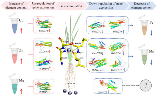 In this regard, the chelation of OsMTP with Ga3+ ions is a detoxification process to reduce the phytotoxicity of Ga stress to rice plants. However, the role of OsMTP in transporting mineral elements was never taken lightly. Therefore, the trade-off between transporting mineral elements and chelating Ga3+ ions was unavoidable. We noticed that Ga accumulation in rice plants significantly altered the expression patterns of rice OsMTP genes and the distribution of mineral elements in subcellular compartments in rice tissues. The interconnection between Ga accumulation, concentrations of mineral elements, and individual rice OsMTPs is presented in Figure 6.