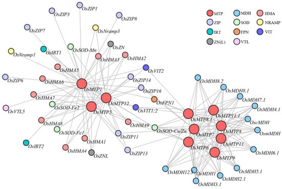 Several types of metal transport proteins were clarified in plants, including the heavy metal ATPase family (HMAs), MTPs, natural resistance-associated macrophage proteins (NRAMPs), the iron-regulated transporter (IRT), the ferroportin (FPN), the vacuolar iron transporter (VIT) and Zn-regulated transporter, and the Fe-regulated transporter-like family (ZIP) [42,43,44,45,46]. Mostly, plants’ physiological processes were chiefly regulated by various genes through the coordinated and interacted network. Herein, the co-expression network of individual OsMTP genes were conducted by the STRING program (Figure 7). The interactome analysis revealed that OsMTP1 highly interacts with seven different types of genes; however, major interactive genes are associated with metal transport, such as OsFPN, OsHMAs, OsNRAMP, OsIRT, OsVIT, and OsZIP, wherein OsMTP1 is highly activated with OsSOD genes. It is also noticed that OsMTP12 highly interacts with OsHMAs, OsIRT, OsVIT, OsNRAMP, OsZIP, and OsSOD. However, somewhat interesting results were obtained for OsMTP6, OsMTP7, OsMTP6, OsMTP8, OsMTP8.1, OsMTP9, OsMTP11, and OsMTP11.1, wherein the major interactive genes of these genes are highly related to malate dehydrogenase rather than metal transport. The detailed information of the interactive genes of individual OsMTP is provided in Supporting Information Table S4.