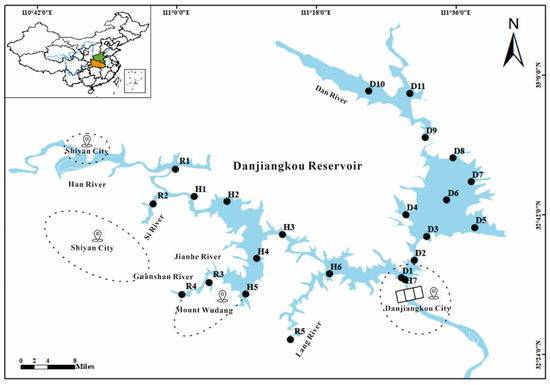 A map showing the sampling sites in the Danjiangkou Reservoir in Hubei Province.