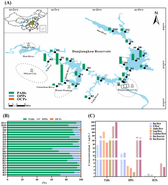The occurrence of three types of organic pollutants in surface waters of the Danjiangkou Reservoir. (A) The spatial distributions of three types of organic pollutants in the Danjiangkou Reservoir. (B) The composition of three types of organic pollutants in surface water of the Danjiangkou Reservoir. (C) A histogram of the organic pollutant concentrations in different areas of the Danjiangkou Reservoir. PAHs: polycyclic aromatic hydrocarbons; OPPs: organophosphates; OCPs: organochlorines.