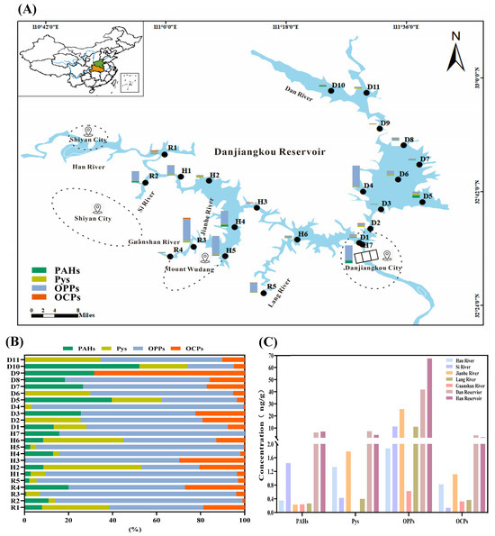 The Danjiangkou Reservoir, which spans the provinces of Henan and Hubei, holds a distinctive position as the largest artificial freshwater lake in Asia and serves as the confluence of the Han and Dan Rivers. It plays a crucial role in the Middle Route Project of China’s South-to-North Water Diversion initiative, annually supplying the substantial amount of 95 billion cubic meters of clean water to 14 major cities in northern China [1]. The land use in the vicinity of the reservoir encompasses forest land (consisting of natural forests and orchards), agricultural land (which includes dry land and paddy fields), and wetlands, as well as industrial areas. Consequently, the reservoir faces pollution threats from various human activities within its watershed, including industrial discharge, pesticide and fertilizer applications, and livestock manure [2]. Considering its strategic importance in both ecological and socio-economic development, the occurrence of organic pollutants in the aquatic environments of the Danjiangkou Reservoir and their potential harm to aquatic ecosystems and human health have received increasing attention [3,4]. Although previous studies mainly focused on water quality parameters related to eutrophication [5], occurrences of various of organic pollutants including perfluorinated substances [6], antibiotics, and microplastics have been recently detected [1,7]. According to existing studies, Polychlorinated Biphenyls (PCBs), Polybrominated Diphenyl Ethers (PBDEs), and pharmaceuticals and personal care products (PPCPs) have been detected in the Danjiangkou Reservoir. Among these, the concentration of PPCPs is relatively low, while PBDEs pose a significant risk to fish [8,9,10]. Habitat surveys indicate that agricultural activities are frequent near the Danjiangkou Reservoir, leading to the unavoidable use of pesticides and fuel combustion. Although industrial production and healthcare facilities are located relatively far from the reservoir, research on pollutants related to the Danjiangkou Reservoir is still relatively scarce. Current studies are insufficient to support the transition of water environment management goals from merely maintaining water quality standards to protecting ecological and health safety. On the one hand, as China is a leading agricultural nation, the use of pesticides is an important source of water pollution [11,12]. Since some traditional organochlorines (OCPs) have been prohibited in agriculture, more products have been introduced into the market, including organophosphates (OPPs) and pyrethroids. Although OPPs and pyrethroids degrade more readily than organochlorines, they may exhibit toxicity to aquatic organisms such as fish, mollusks, and arthropods, and even pose a potential threat to human health through residues in food [12] such as organophosphates pyrethroids, with some classified as global endocrine disruptors [12]. A pesticide risk assessment of Lake Taihu as well as the Jiulong River in South China found that pesticides pose a risk to the ecosystem and to people [12,13,14]. On the other hand, polycyclic aromatic hydrocarbons (PAHs) are a group of persistent organic pollutants (POPs) with two or more benzene rings, which primarily originate from industrial activities such as fossil fuel, petroleum development, and oil transportation, as well as some natural resources [15,16,17]. Polycyclic aromatic hydrocarbons (PAHs) are widely present in ecological environments [18,19]. Studies that have assessed the risk of PAHs in the Yellow River Delta and along the coast of Bohai Bay have found that PAHs pose ecological risks and harm to aquatic organisms [20,21]. Moreover, When PAHs in drinking water reach a certain concentration, they may pose a risk to human health [22], reminding us to pay attention to these pollutants.