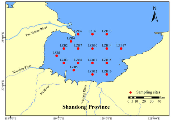 Laizhou Bay (LZB), located in the south Bohai Sea in China, has become significantly contaminated in recent years because of the detrimental effects of industrial effluents, domestic sewage, and land-based river pollution resulting from rapid industrialization and urbanization [22]. Moreover, LZB is a semi-enclosed bay with poor water dynamics and has been affected by the pronounced accumulation of pollutants. Researchers have identified high levels of POPs, including polychlorinated diphenyl ethers [27], dioxins [28], and organophosphate esters [29], and analyzed their potential behavior of trophic transfer in the LZB food web. However, the analysis of SCCPs needs to be expanded. In this study, the surface seawater, sediments, and organisms of LZB were collected to analyze the concentration and homolog distribution of SCCPs. Based on the LZB food web model, the trophic transfer potential of SCCPs along different food chains was analyzed, and the influencing factors were discussed. A risk assessment of the SCCPs in LZB was conducted to improve related research studies.
