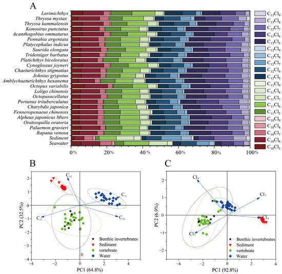 Abundance profile of SCCPs in seawater, sediments, and organisms (A); PCA of the number of carbon atoms (B) and chlorine atoms in SCCPs in seawater, sediments, and organisms (C).
