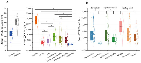 Comparison of SCCPs in samples obtained from LZB (A) and in different biological and ecological features (B). Note that “ND” indicates no difference between the variables and “*” indicates a significant difference, as does p < 0.05.