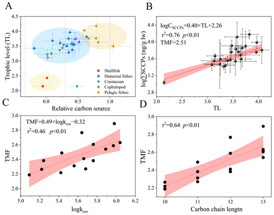 Relative carbon source and trophic levels characterized the food web relationship (A). Relationship between TL and log-transformed concentrations of the SCCPs (ng/g l.w.) (B) and the relationships of TMFs of the SCCP congener group with logKow (C) and the carbon chain length (D). Note: The red section indicates the 95% confidence interval.