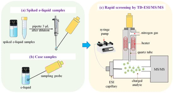 Schematic diagram of the rapid screening of etomidate and its analogs in e-liquid by TD-ESI/MS/MS: (a,b) sampling, (c) TD-ESI-MS analysis.