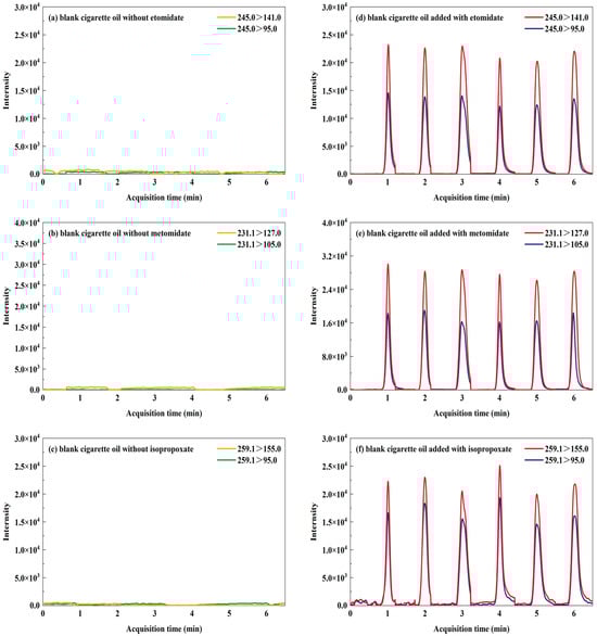 MRM chromatograms of blank e-liquid samples (a–c), blank e-liquid samples added with 100 ng/mL etomidate (d), metomidate (e), and isopropoxate (f).