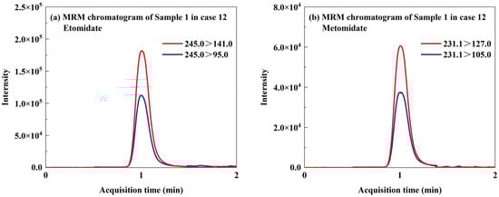 As shown in Table 2, the inter-day and intra-day precision of etomidate in e-liquid samples were less than 19.1% and 16.7%, respectively; the inter-day and intra-day accuracy ranged from −4.2% to 9.5% and from −0.3% to 8.2%, respectively. For metomidate in e-liquid samples, the inter-day and intra-day precision were below 19.9% and 17.1%, respectively, with inter-day and intra-day accuracy ranging from −15.1% to 5.6% and from −16.1% to 4.0%, respectively. In the case of isopropoxate in e-liquid samples, the inter-day and intra-day precision were less than 11.5% and 12.6%, respectively, and the inter-day and intra-day accuracy were within the ranges of −8.4% to 13.1% and −11.8% to 13.6%, respectively. These results suggest that the developed method for the analysis of etomidate, metomidate and isopropoxate in e-liquid samples could demonstrate good reproducibility. The matrix effect values for etomidate ranged from 2.0% to 12.7%, for metomidate from 1.8% to 16.5%, and for isopropoxate from 1.9% to 19.5%. The LODs of etomidate, metomidate and isopropoxate detected by TD-ESI/MS/MS method were 3 ng/mL. Previous studies [,] have reported that the LODs and LLOQs of illicit drugs in e-liquids. The LOD and LOQ of tetrahydrocannabinol in CBD e-liquids detected by LC-HRAM-MS method were 1 μg/g and 5 μg/g, respectively []. Liu et al. reported that the LOQ of synthetic cannabinoid was 25 ng/mL by GC-MS method []. The highly sensitive instrumental analysis for TD-ESI/MS/MS method enables simplified pre-treatment procedures, facilitating rapid on-site screening of e-liquids.