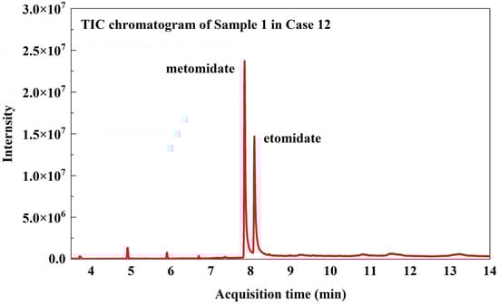 In 2024, the Fujian Fuzhou Public Security Bureau provided our lab with numerous bottles of e-liquid for us to conduct qualitative and quantitative analyses as part of a forensic toxicology investigation. The established TD-ESI/MS/MS method was used to rapidly screen 70 seized e-liquid samples in 12 cases. In the process of making illicit e-liquid, suspects would inevitably leave traces of illicit drugs on the surface of the cartridge due to the contact between their hands or tools and the cartridge. The TD-ESI/MS/MS method exhibits high sensitivity, with detection limits for etomidate, metomidate, and isopropoxate reaching 3 ng/mL. There was no need to disassemble the pod, and the metal probe sampling ring is directly scraped on the surface of the pod shell about 3 cm in length, and the illicit drugs distributed on the surface of the pod shell could be obtained without affecting the integrity of the sample appearance. The sampled metal probe was directly inserted into the ion source inlet for detection. After the test was completed, the probe was removed, and the whole instrument screening process was completed within 1 min. The results of the case were shown in Table 4. Screening of 70 seized e-liquid samples from 12 cases using TD-ESI/MS/MS revealed that 46 samples (65.7%) contained only etomidate, 13 samples (18.6%) contained only isopropoxate, and 11 samples (15.7%) contained both etomidate and metomidate. The qualitative results obtained from TD-ESI/MS/MS were in complete agreement with those of GC-MS. The MRM chromatogram from the TD-ESI/MS/MS method and the TIC (Total Ion Current) profile from the GC-MS method for the representative sample (Sample 1 from Case 12) were shown in Figure 4 and Figure 5, respectively. Following the extraction of quantitative ions using the GC-MS method and comparison with standards, the following quantitative results were obtained: the content of etomidate, metomidate, and isopropoxate in the seized e-liquid samples ranged from 12.1% to 27.2%, 9.9% to 13.5%, and 17.3% to 27.3%, respectively. This result indicated that the content of etomidate substances in the seized e-liquid samples is very high, and the quantitative results were 9.9–27.3%, which was related to the excellent solubility of etomidate substances in e-liquid. This finding contrasts significantly with the literature reports indicating that synthetic cannabinoids are illegally added to e-liquids at concentrations of 0.1% to 2.7% [,,]. In addition, despite the e-liquid samples seized in the same case having a uniform appearance, the types and concentrations of illegally added substances varied. E-liquid containing high concentrations of etomidate substances may also be diluted by drug traffickers multiple times before being sold to abusers for consumption, and the types and contents of e-liquid obtained by abusers from different illicit sources were uncertain, which would greatly increase the risk of adverse consequences of abusing such illicit products.