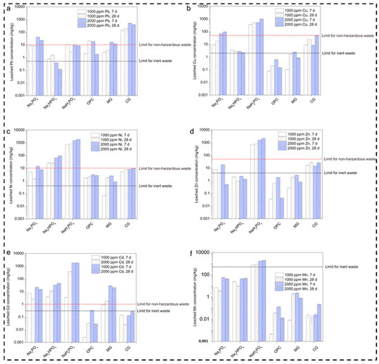Regarding zinc leaching, the results of the present study indicate that Na3PO4 and NaH2PO4 led to particularly high leaching at 2000 ppm after 28 days, as shown in Figure 3d. Meanwhile, Na2HPO4 showed lower zinc leaching as compared to the other phosphate compounds, although it still exceeded the inert waste limit of 2 mg/kg at both concentrations. OPC also showed a lower leaching level after 28 days, which indicates strong immobilization. However, MgO and CaO exhibited relatively high leaching values at 28 days. The reason behind the phosphate compounds’ inability to effectively immobilize Zn may be its intermediate dissociation. Moreover, leaching by MgO and CaO creates an alkaline environment for the immobilization of metals [38].
