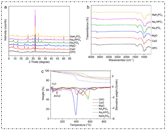 On the other hand, Figure 4 presents the weight loss for each temperature, suggesting that the most abundant hydrate appeared with OPC. The hydrated C-S-H might provide substantial strength and promote the adsorption and encapsulation of toxic metals, as reported in [55]. Moreover, the reduction in mass loss in this study indicates that the metals were immobilized more effectively by the binder, rendering them more stable in the soil. Furthermore, CaCO3 appeared to be the predominant hydration product in this sample, which was consistent with the FTIR results. It is proposed that CaCO3 could sequester toxic metals, and CaO could promote the precipitation of toxic metals by increasing the pH of the solidified bodies, which is also consistent with the study in [30].