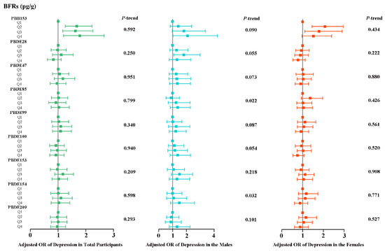 Figure 2 shows the results of logistic regression analyses of the link between nine single serum BFR concentrations and the prevalence of depression among adults. After adjusting a suite of confounding factors, some BFRs (especially PBB153) still showed a remarkable positive link with the prevalence of depression (p < 0.05). In detail, compared with Q1 of PBB153, the risk of depression all augmented, and the weighted OR with 95% CIs were 1.670 (1.254, 2.223), 1.627 (1.171, 2.259), and 1.787 (1.200, 2.661) for Q2, Q3, and Q4 respectively. For male participants, the Q4 of PBB153 was 2.086-fold odds with depression than Q1 (OR = 2.086; 95%CI: 1.026, 4.242). For female participants, compared with Q1 of PBB153, the risk of depression went up, and the weighted OR with 95% CIs were 2.076 (1.455, 2.960) and 1.797 (1.112, 2.905) for Q2 and Q3, respectively. Second, in male participants, PBDE28 was also discovered to be positively associated with depression risk at Q3 concentrations, with a weighted OR value of 1.798 (1.082, 2.988). However, no significant association was found between the remaining seven BFRs and the risk of depression.