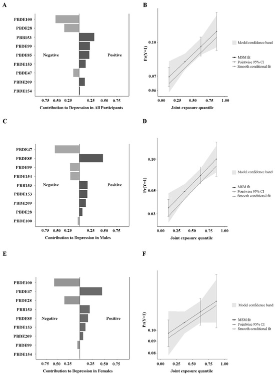 We reperformed all analyses using lipid-adjusted serum BFR concentrations. Figure 4 shows the weighted odds ratios (95% CIs) of depression by quartiles of ln-transformed serum lipid-adjusted BFR levels in all participants. We found that compared to PBB153, lipid-modulated PBB153 had an enhanced association with depression risk in men and an attenuated link in women. Figures S5–S7 displayed the continuous relationship of nine ln-transformed serum lipid-adjusted BFR levels associated with depression risk based on RCS analysis. The results showed that BFRs before and after lipid modulation were largely consistent with a nonlinear relationship with depression risk. Figure S8 shows the results of rating the significance of all BFRs to outcomes in the WQS model. A, B, and C are the serum BFRs before lipid adjustment, while D, E, and F are the serum BFRs after lipid adjustment, with negligible changes between the two. On the whole, PBB153 had a significant influence on the risk of depression in both men and women (p < 0.05), whereas PBDE85 had the greatest effect on the risk of depression in males. Table S5 shows the detailed results of the WQS model, in which mixed exposure to BFRs is significantly positively correlated with the risk of depression in the male population (OR (95%CI) was 2.185 (1.074, 4.447), p = 0.031). These findings are broadly compatible with those from the QGC model. Figure S9 revealed the ratio of positive and negative effects of lipid-adjusted BFRs on depression and the joint effects of exposure to mixed BFRs in the QGC model. Similarly, mixed exposure to lipid-adjusted BFRs was positively and significantly (p < 0.05) related to the risk of depression in the overall population and men but not significant in women. We speculate that after lipid modulation, the lipid differences between individuals are reduced, and the concentration of serum BFRs is closer to the true exposure level, so the association between BFRs and depression is somewhat attenuated. Even so, we did find a positive relationship between serum BFRs and the risk of depression in different groups.