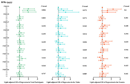 Weighted odds ratios (95% CIs) of depression by quartiles of ln-transformed serum lipid-adjusted BFR levels in all participants. The squares and horizontal lines represent the ORs and 95% CIs, respectively. All of the models are adjusted for demographic characteristics (age, race, educational levels, marital status, and PIR), lifestyle (BMI categories, cotinine levels, and alcohol consumption), and self-reported hypertension and diabetes conditions.