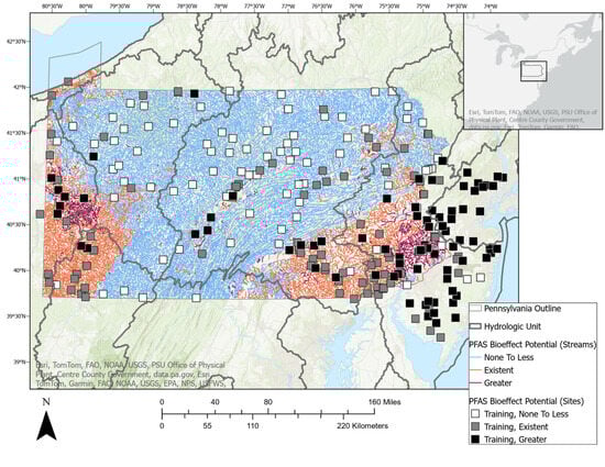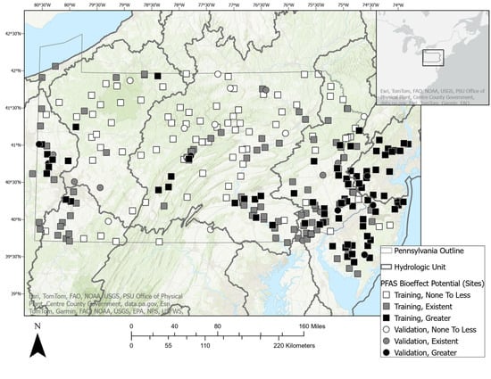 Map of the PFAS bioeffect potential in 280 stream sites in watersheds of Pennsylvania and New Jersey, U.S. Machine learning training sites are represented by squares and validation sites are represented as circles.