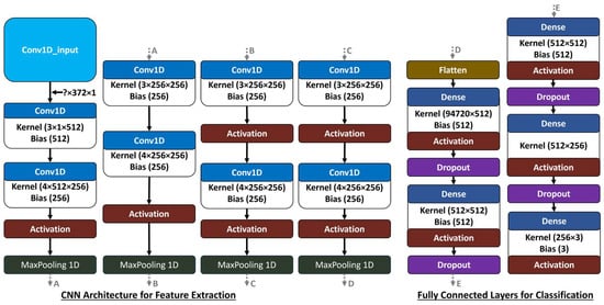 Schematic representation of the Convolutional Neural Network (CNN) architecture that illustrates each layer’s configuration, including the number of filters, kernel sizes, activation functions, and pooling layers. The architecture begins with an input layer (Conv1D_input in light blue), followed by a series of Conv1D layers (blue) with specific kernel dimensions and filter counts, each activated (red) by non-linear functions to facilitate complex feature extraction. MaxPooling1D layers (green) are interspersed throughout to downsample spatial dimensions while retaining essential features. Toward the output, fully connected Dense layers (dark blue) are utilized, incorporating dropout regularization (purple) to reduce overfitting. [The letters A through E in the CNN schematic are used to indicate the sequence of layers in the network. They don’t represent any specific meaning or functionality within the network; the ? from the Conv1D_input indicates that the batch size is dynamic and can be any positive integer].