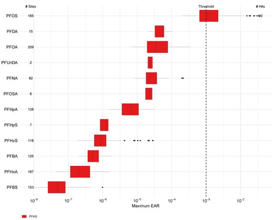 Maximum EARs for PFAS detected in 280 northeast U.S. streams, 2016 through 2023 using effect concentrations derived from ToxCast activity concentrations. The dashed line represents a threshold of 0.001 for ToxCast activity concentrations. Censored values were not included in boxplots. The number of sites (# sites) where each compound was detected is included along the y-axis. Site-wise EARs are detailed in Table S8. [Boxes, 25th to 75th percentiles; dark line, median; whiskers, data within 1.5× the interquartile range (IQR); circles, values outside 1.5× the IQR].