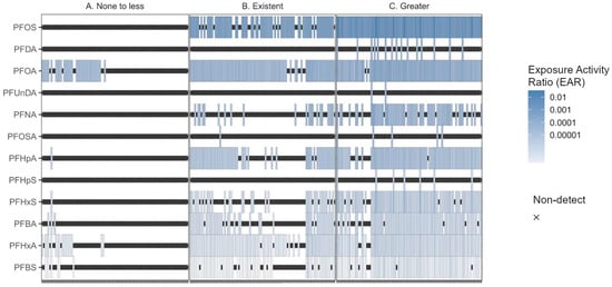 Heatmaps of maximum EARs from surface water concentrations of PFAS at 280 northeast U.S. stream reaches, 2016 through 2023 using effect concentration estimates from ToxCast activity concentrations. The x-axis represents individual sites that are separated into panels of machine learning classifications of PFAS bioeffect potential of (A) None to less, (B) Existent, and (C) Greater.