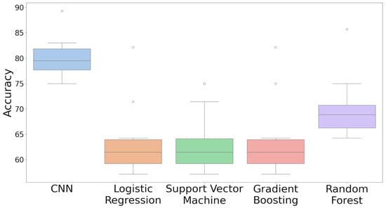 The ranges observed for each model illustrate the extent of variability in accuracy outcomes across the repeated iterations. For instance, the CNN’s range of 75% to 89% indicates the lowest and highest accuracy achieved during CNN testing, respectively. In comparison, the Random Forest, Gradient Boosting, Logistic Regression, and SVM exhibited wider ranges of accuracy. These ranges, alongside the medians, provide a comprehensive summary of the accuracy distributions, reflecting the behavior of each model under different data splits.