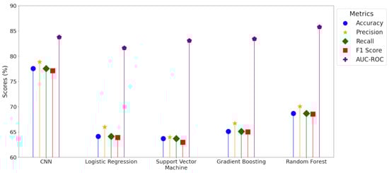 The performances of five different classification models, including CNN, Logistic Regression, SVM, Gradient Boosting, and Random Forest, were evaluated over the 25 training and validation iterations using a set of key metrics, including accuracy, precision, recall, F1 score (accounts for precision and recall), and AUC-ROC (Table S6).