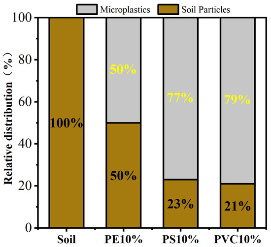 To investigate the adsorption of BaP by soil, microplastics were mixed with soil at a ratio of 0.1 g of microplastics to 1 g of soil, as shown in Figure 1. The results indicated that with an initial BaP concentration of 1 mg L⁻1, the amounts of BaP adsorbed by the soil with added PE, PS, and PVC were 0.060 mg g⁻1, 0.072 mg g⁻1, and 0.075 mg g⁻1, respectively. Compared with adsorption by soil alone (0.017 mg g⁻1), the addition of microplastics enhanced BaP adsorption by 2.53 times (PE), 3.50 times (PS), and 3.69 times (PVC). To better elucidate the role of microplastics in the adsorption of BaP within the soil–microplastic system, we further analyzed the distribution of BaP between the soil and microplastic particles, as shown in Figure 2. When 10% microplastics were added to the soil, the distribution ratios of BaP in the soil and PE microplastics were 50% each. In contrast, the distributions of BaP on PS microplastics and the soil were 77% and 23%, respectively, while the distributions of BaP on PVC microplastics and the soil were 79% and 21%, respectively. These results indicate that BaP preferentially adheres to microplastics over soil, with the affinity order being PVC > PS > PE, which is consistent with the adsorption outcomes.