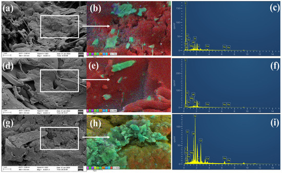 SEM-EDS images of microplastics adsorbing BaP after soil pre-treatment (PE, PVC and PS), PE (a–c), PS (d–f) and (g–i) with magnification of 10,000× for image. Elemental composition (via EDS) is shown as insets in each subpanel. PE (b,c), PS (e,f) and PVC (h,i).