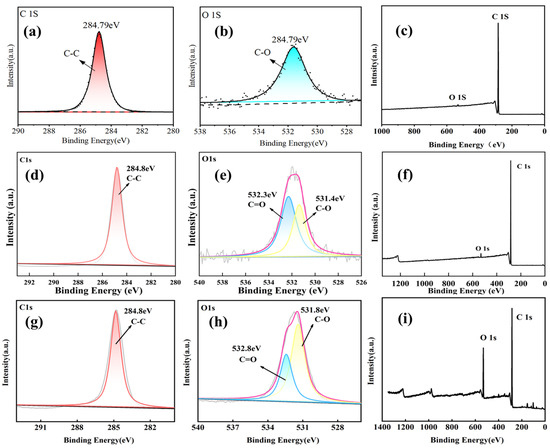 XPS spectra of PE microplastics before and after sorption; high-resolution XPS spectra of C 1s (c) and O 1s (d) regions of PE microplastics. PE (a–c), PE+BaP (d–f), and PE+Soil+BaP (g–i).